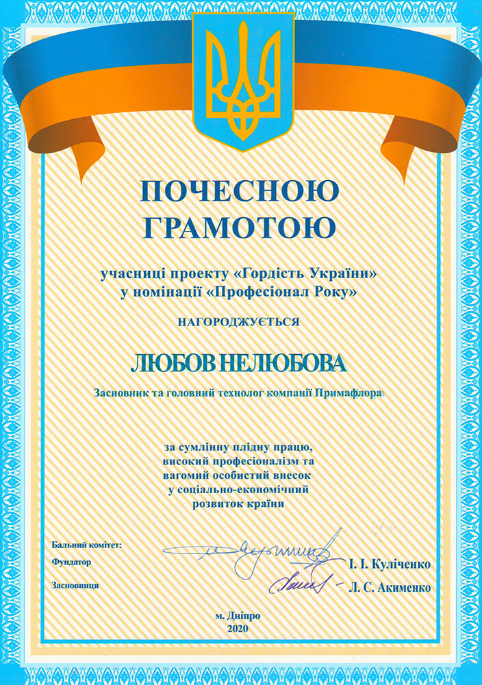 Засновник і технолог ТМ «ПРИМАФЛОРА» Любов Нелюбова стала учасницею проекту «ГОРДІСТЬ УКРАЇНИ 2020» у номінації «ПРОФЕСІОНАЛ РОКУ», за версією MILLENIUM CLUB, нагороджена орденом «НАГРАДА ТИСЯЧОЛІТТЯ» та підтверджуючим сертифікатом №219 про входження до асамблеї БІЗНЕС-КОРОЛІВ 2017.