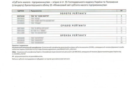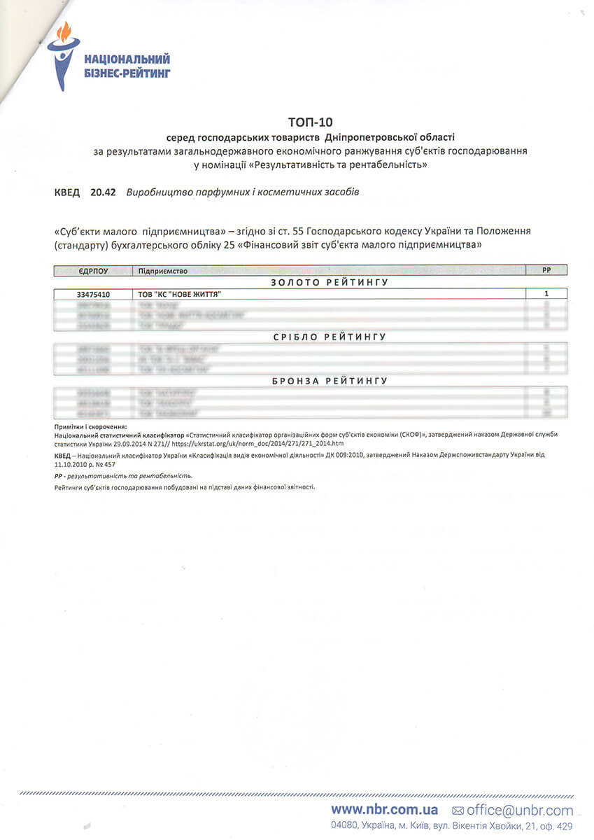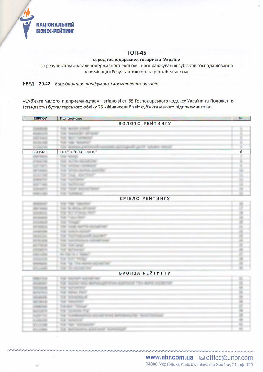 За підсумками загальнодержавного комплексного ранжування 311430 юридичних осіб на основі аналізу фінансово-економічних показників визначено успішних представників національної економіки. Цей лист - офіційне свідчення того, що Ваше підприємство завдяки ефективності обраної стратегії розвитку зайняло високі позиції у рейтингу та номіновано на нагороду “Лідер року 2018”.